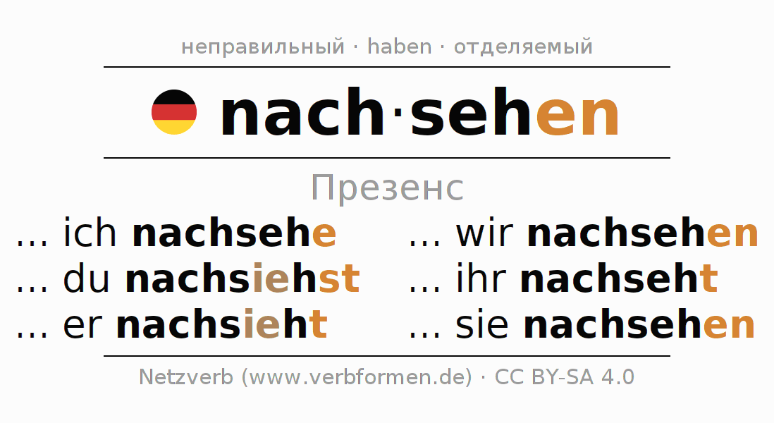 Этот глагол nachsehen полностью спрягается во всех лицах и числах Презенс Индикатив.