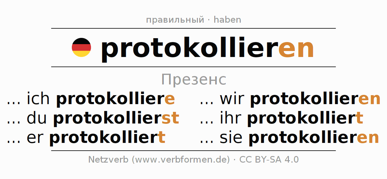 Этот глагол protokollieren полностью спрягается во всех лицах и числах Презенс Индикатив.