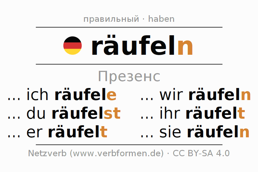Спряжение räufeln в Презенс Индикатив Настоящее время Действительный залог (актив): ... ich räuf(e)le, ... du räufelst, ... er räufelt, ... wir räufeln, ... ihr räufelt, ... sie räufeln.Образование этих форм происходит по определённым грамматическим правилам. Так же спрягаются простые глагольные формы räufeln в Презенс. Kомментарии ☆