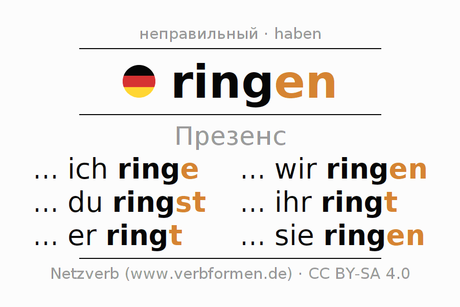 Спряжение ringen в Презенс Индикатив Настоящее время Действительный залог (актив): ... ich ringe, ... du ringst, ... er ringt, ... wir ringen, ... ihr ringt, ... sie ringen.Образование этих форм происходит по определённым грамматическим правилам. Так же спрягаются простые глагольные формы ringen в Презенс. Kомментарии ☆