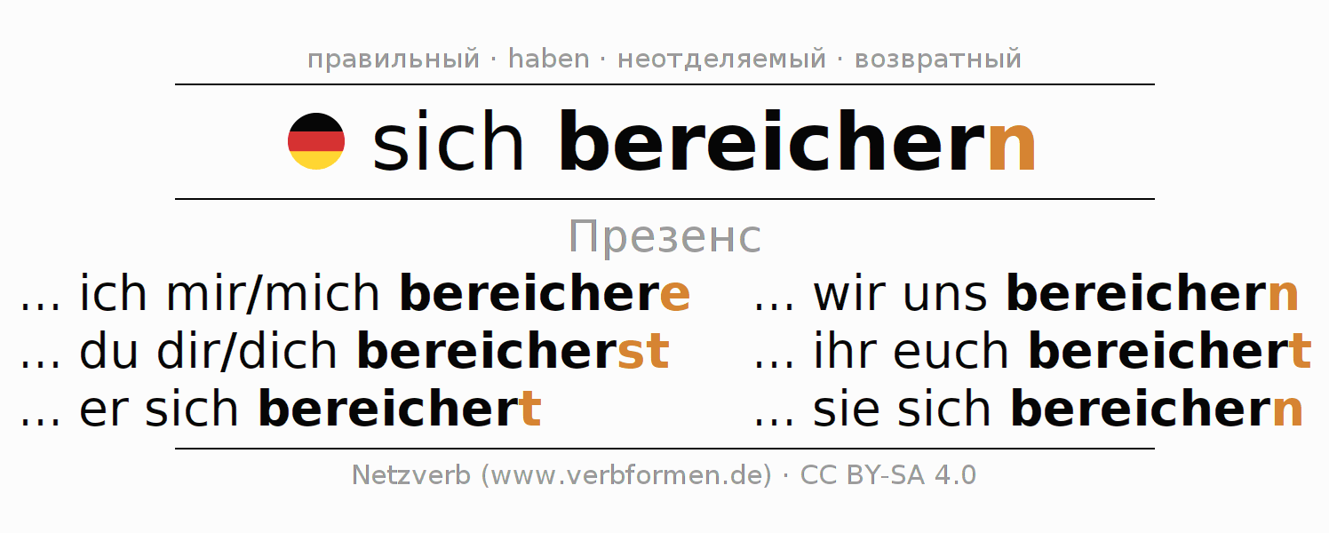 Этот глагол sich bereichern полностью спрягается во всех лицах и числах Презенс Индикатив.