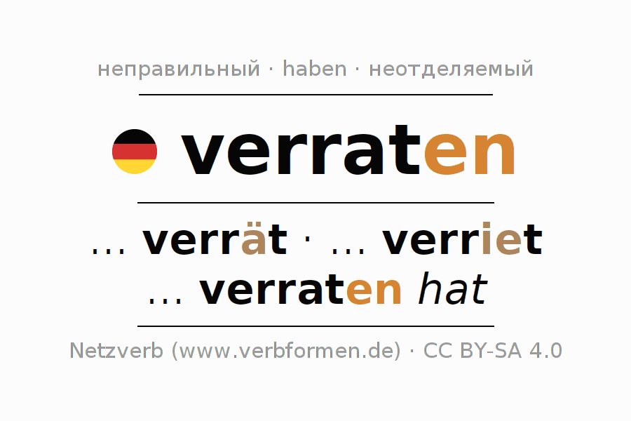 Спряжение verraten в Презенс Индикатив Настоящее время Действительный залог (актив): ... ich verrate, ... du verrätst, ... er verrät, ... wir verraten, ... ihr verratet, ... sie verraten.Образование этих форм происходит по определённым грамматическим правилам. Так же спрягаются простые глагольные формы verraten в Презенс. Kомментарии ☆