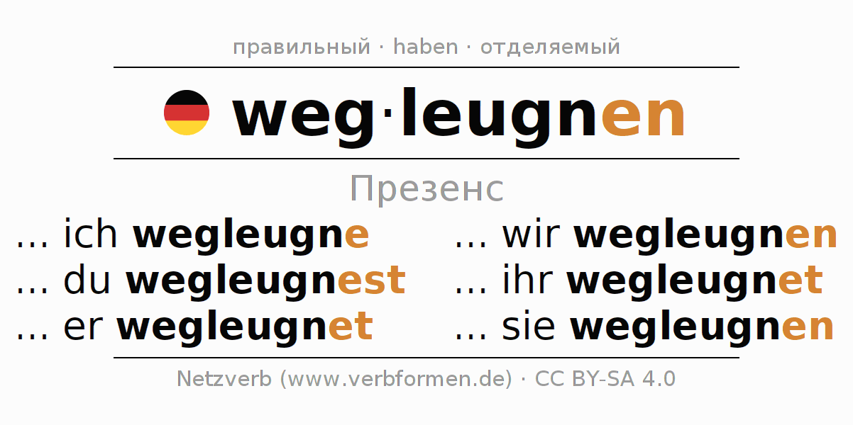 Спряжение wegleugnen в Презенс Индикатив Настоящее время Действительный залог (актив): ... ich wegleugne, ... du wegleugnest, ... er wegleugnet, ... wir wegleugnen, ... ihr wegleugnet, ... sie wegleugnen.Образование этих форм происходит по определённым грамматическим правилам. Так же спрягаются простые глагольные формы wegleugnen в Презенс. Kомментарии ☆