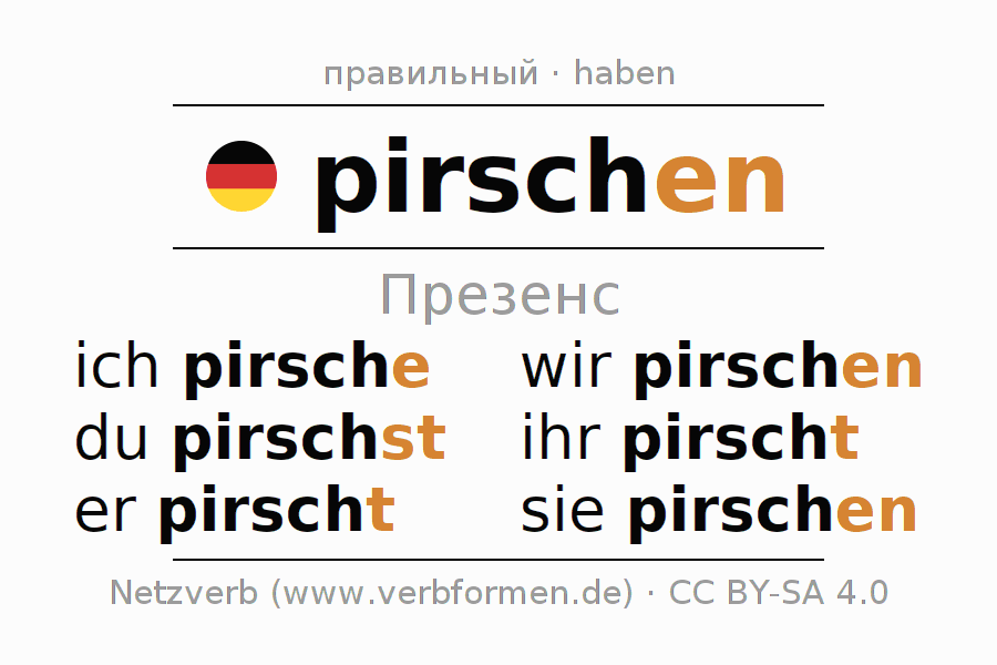 Спряжение pirschen (подкрадываться, красться) в настоящем времени Презенс: ich pirsche, du pirschst, er pirscht, wir pirschen, ihr pirscht, sie pirschen