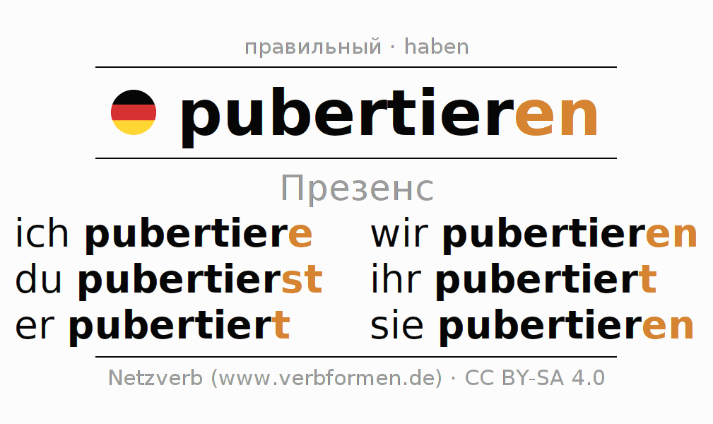 Спряжение pubertieren (пубертатный) в настоящем времени Презенс: ich pubertiere, du pubertierst, er pubertiert, wir pubertieren, ihr pubertiert, sie pubertieren
