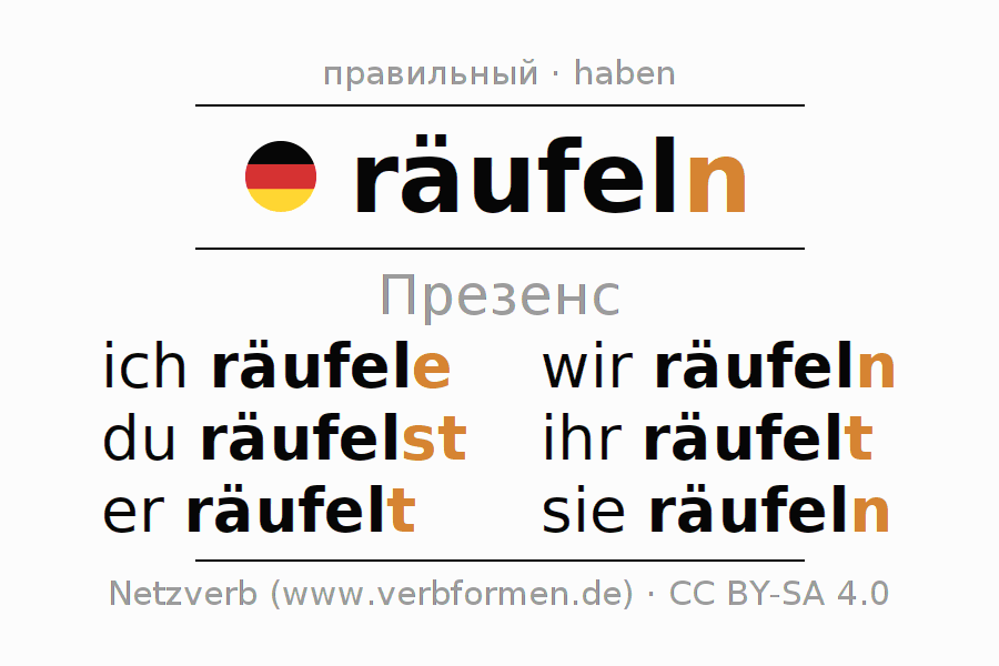 Спряжение räufeln (возмущаться, греметь) в настоящем времени Презенс: ich räuf(e)le, du räufelst, er räufelt, wir räufeln, ihr räufelt, sie räufeln