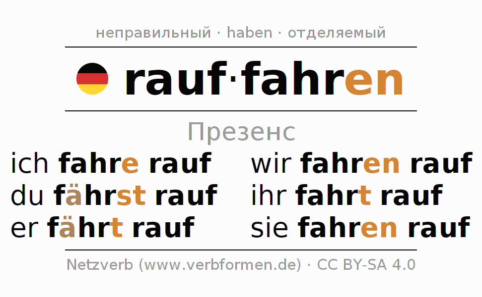 Спряжение rauffahren (подниматься) в настоящем времени Презенс: ich fahre rauf, du fährst rauf, er fährt rauf, wir fahren rauf, ihr fahrt rauf, sie fahren rauf