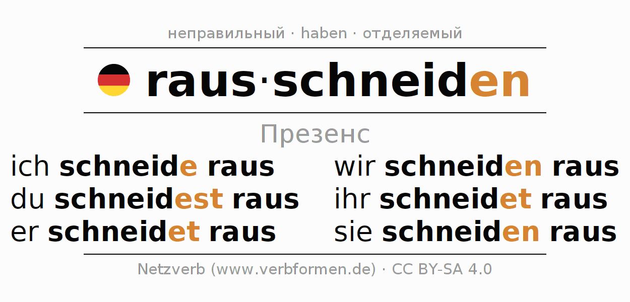 Спряжение rausschneiden (вырезать) в настоящем времени Презенс: ich schneide raus, du schneidest raus, er schneidet raus, wir schneiden raus, ihr schneidet raus, sie schneiden raus
