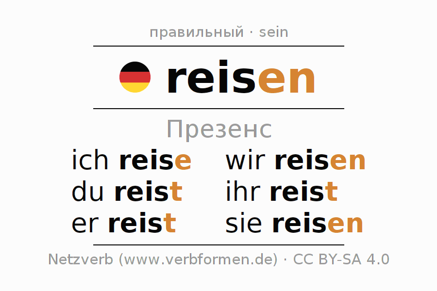 Спряжение reisen (ездить, путешествовать) в настоящем времени Презенс: ich reise, du reist, er reist, wir reisen, ihr reist, sie reisen