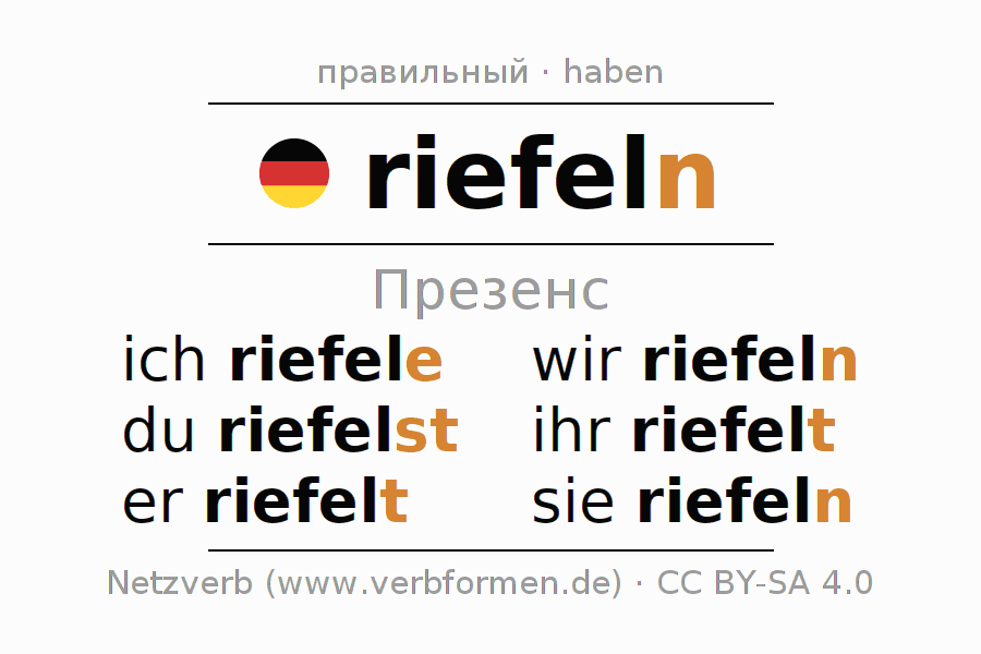 Спряжение riefeln (проводить линию, царапать) в настоящем времени Презенс: ich rief(e)le, du riefelst, er riefelt, wir riefeln, ihr riefelt, sie riefeln