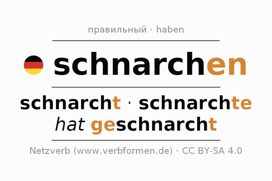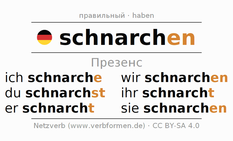 Спряжение schnarchen (храпеть) в настоящем времени Презенс: ich schnarche, du schnarchst, er schnarcht, wir schnarchen, ihr schnarcht, sie schnarchen