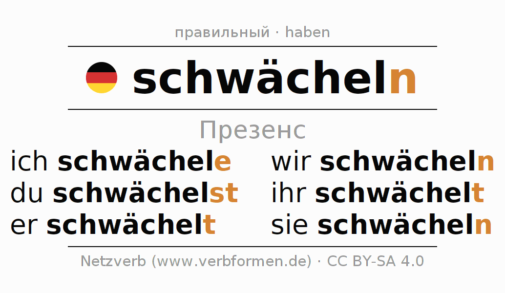 Спряжение schwächeln (ослабевать, ослабеть) в настоящем времени Презенс: ich schwäch(e)le, du schwächelst, er schwächelt, wir schwächeln, ihr schwächelt, sie schwächeln