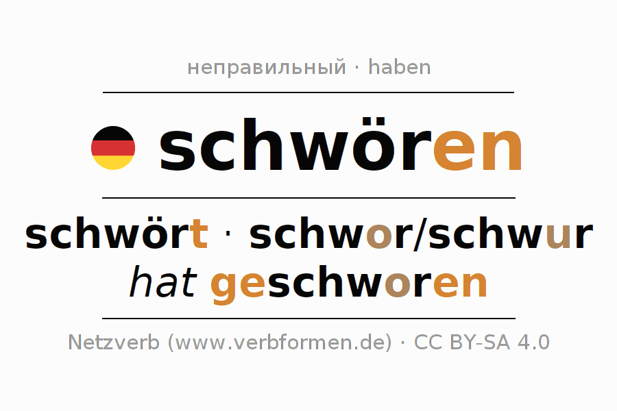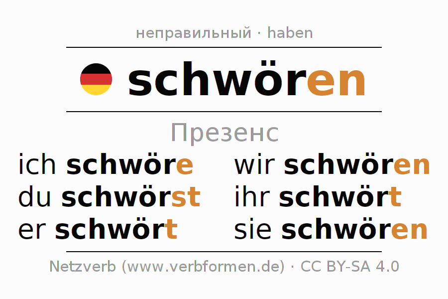 Спряжение schwören (клясться, присягать) в настоящем времени Презенс: ich schwöre, du schwörst, er schwört, wir schwören, ihr schwört, sie schwören
