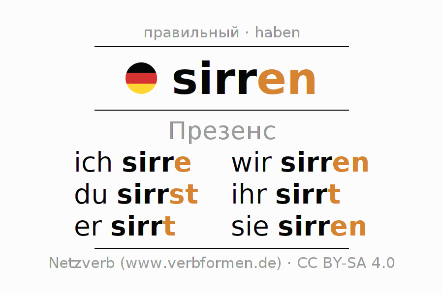 Спряжение sirren (гудение, жужжание) в настоящем времени Презенс: ich sirre, du sirrst, er sirrt, wir sirren, ihr sirrt, sie sirren