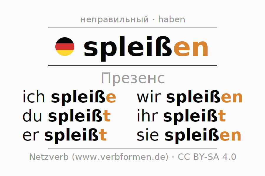 Спряжение spleißen (вырезать интроны, переплетать) в настоящем времени Презенс: ich spleiße, du spleißt, er spleißt, wir spleißen, ihr spleißt, sie spleißen