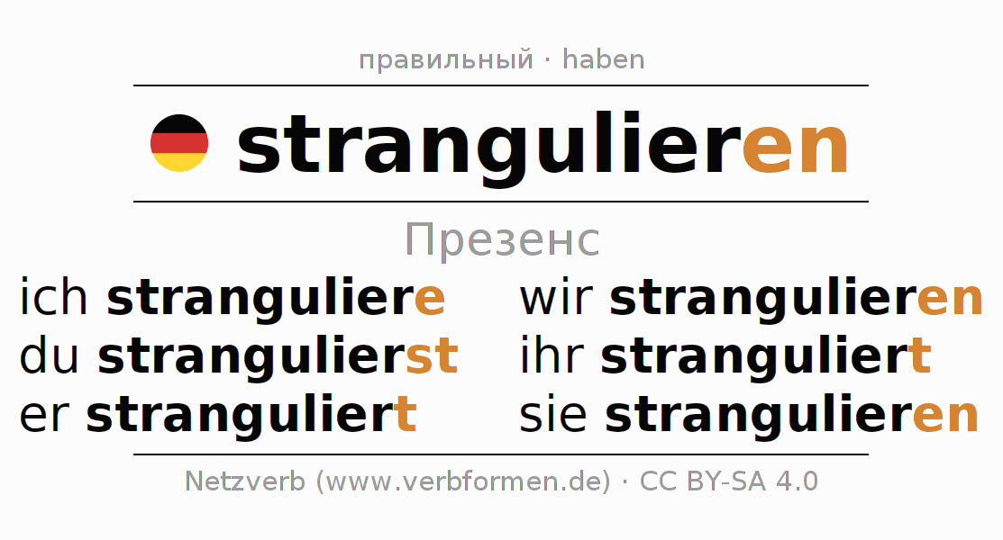 Спряжение strangulieren (душить, задушить) в настоящем времени Презенс: ich stranguliere, du strangulierst, er stranguliert, wir strangulieren, ihr stranguliert, sie strangulieren