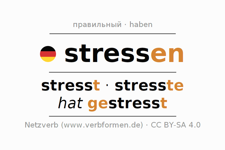 Спряжение stressen (вызывать стресс, давить) в настоящем времени Презенс: ich stresse, du stresst, er stresst, wir stressen, ihr stresst, sie stressen