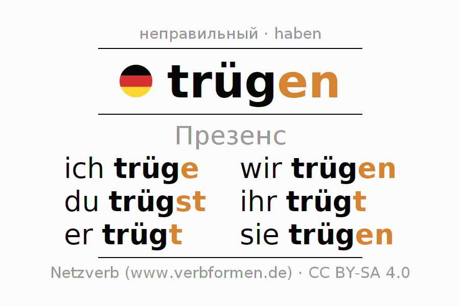 Спряжение trügen (обманывать, вводить в заблуждение) в настоящем времени Презенс: ich trüge, du trügst, er trügt, wir trügen, ihr trügt, sie trügen