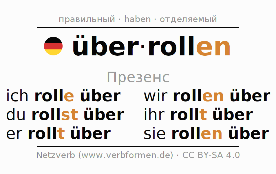 Спряжение überrollen (сбить, наезжать) в настоящем времени Презенс: ich rolle über, du rollst über, er rollt über, wir rollen über, ihr rollt über, sie rollen über