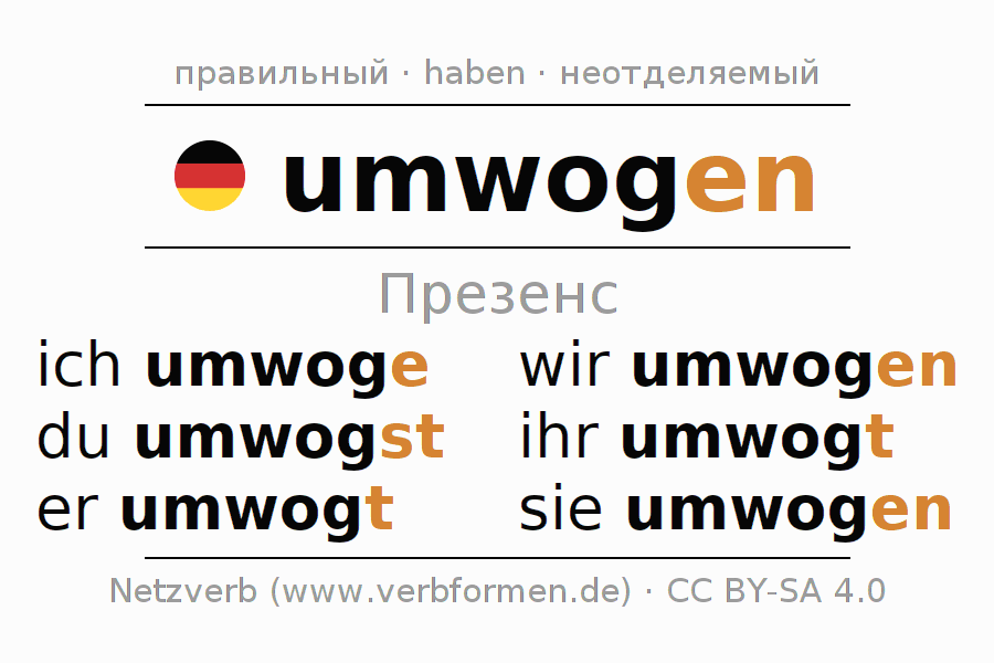 Спряжение umwogen (окружать, обвивать) в настоящем времени Презенс: ich umwoge, du umwogst, er umwogt, wir umwogen, ihr umwogt, sie umwogen