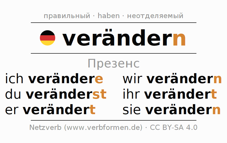 Спряжение verändern (изменять, изменяться) в настоящем времени Презенс: ich veränd(e)re, du veränderst, er verändert, wir verändern, ihr verändert, sie verändern