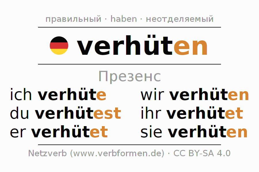 Спряжение verhüten (предотвращать, предупреждать) в настоящем времени Презенс: ich verhüte, du verhütest, er verhütet, wir verhüten, ihr verhütet, sie verhüten