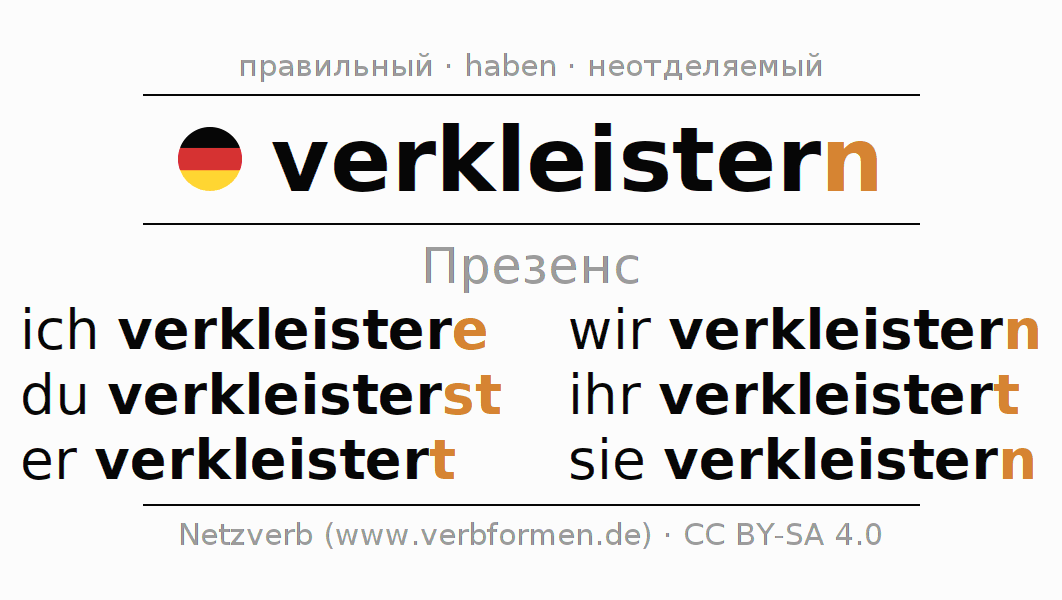 Спряжение verkleistern (клеить, клейкий) в настоящем времени Презенс: ich verkleist(e)re, du verkleisterst, er verkleistert, wir verkleistern, ihr verkleistert, sie verkleistern