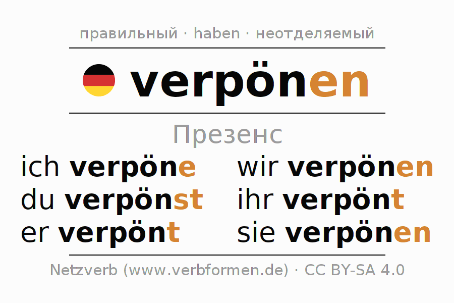 Спряжение verpönen (осуждать, запретить) в настоящем времени Презенс: ich verpöne, du verpönst, er verpönt, wir verpönen, ihr verpönt, sie verpönen