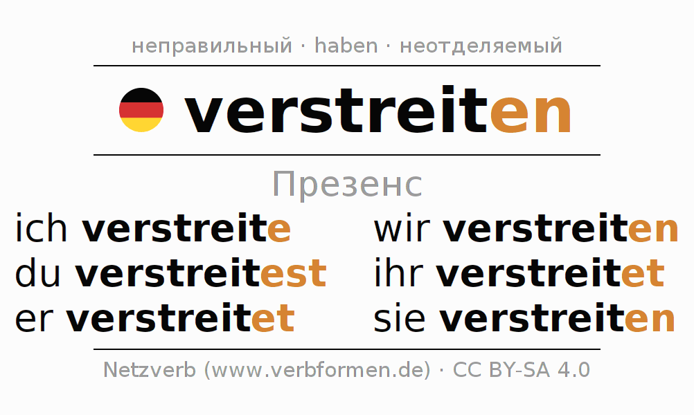 Спряжение verstreiten (поссориться, разойтись) в настоящем времени Презенс: ich verstreite, du verstreitest, er verstreitet, wir verstreiten, ihr verstreitet, sie verstreiten