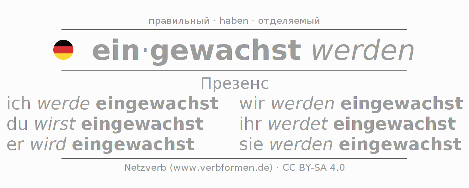 Спряжение einwachsen в Презенс Индикатив Настоящее время Пассив с werden: ich werde eingewachst, du wirst eingewachst, er wird eingewachst, wir werden eingewachst, ihr werdet eingewachst, sie werden eingewachst.Образование этих форм происходит по определённым грамматическим правилам. Так же спрягаются простые глагольные формы einwachsen в Презенс. Kомментарии ☆