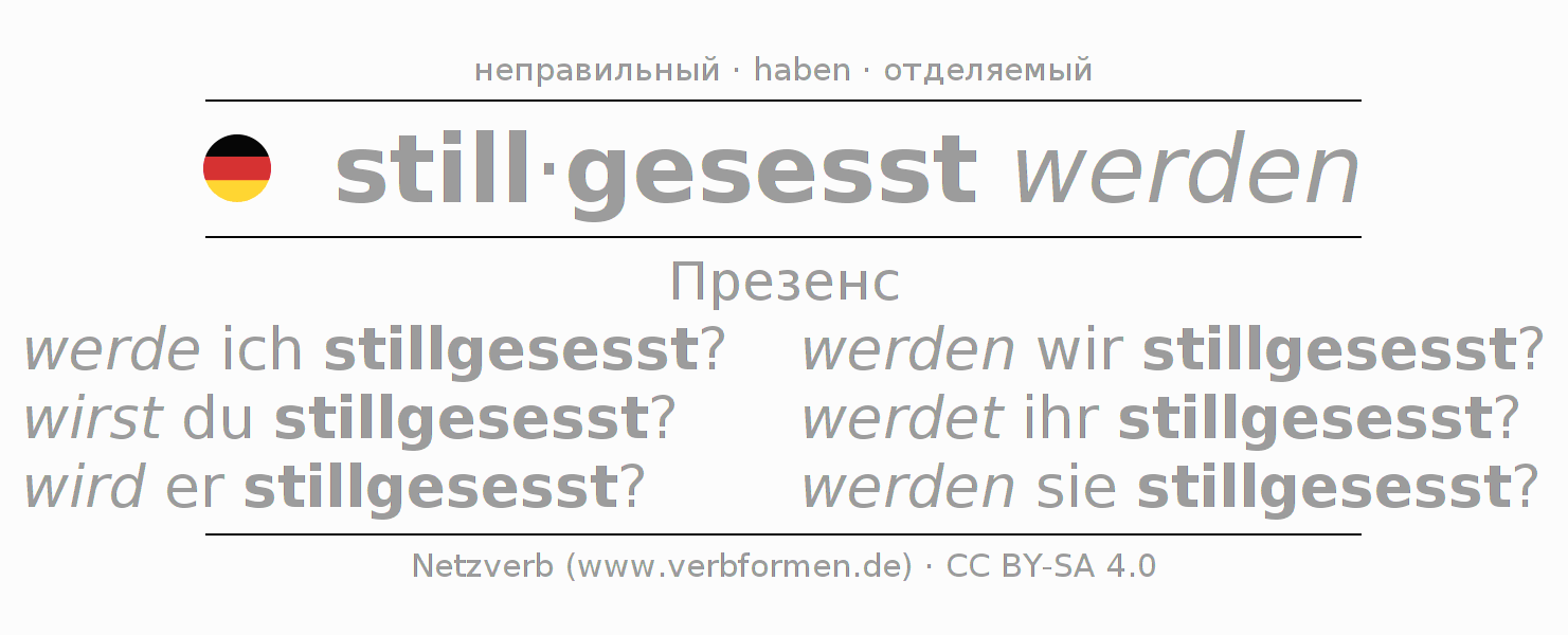 Спряжение stillsitzen в Презенс Индикатив Настоящее время Пассив с werden: werde ich stillgesesst?, wirst du stillgesesst?, wird er stillgesesst?, werden wir stillgesesst?, werdet ihr stillgesesst?, werden sie stillgesesst?.Образование этих форм происходит по определённым грамматическим правилам. Так же спрягаются простые глагольные формы stillsitzen в Презенс. Kомментарии ☆