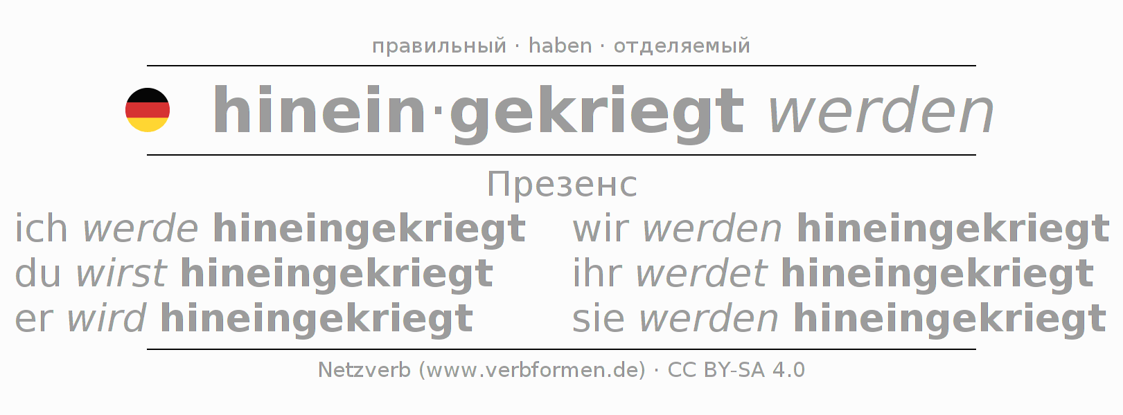 Спряжение hineinkriegen в Презенс Индикатив Настоящее время Пассив с werden: ich werde hineingekriegt, du wirst hineingekriegt, er wird hineingekriegt, wir werden hineingekriegt, ihr werdet hineingekriegt, sie werden hineingekriegt.Образование этих форм происходит по определённым грамматическим правилам. Так же спрягаются простые глагольные формы hineinkriegen в Презенс. Kомментарии ☆