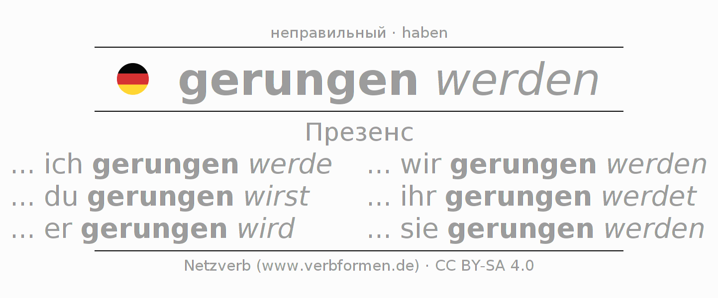 Спряжение ringen в Презенс Индикатив Настоящее время Пассив с werden: ... ich gerungen werde, ... du gerungen wirst, ... er gerungen wird, ... wir gerungen werden, ... ihr gerungen werdet, ... sie gerungen werden.Образование этих форм происходит по определённым грамматическим правилам. Так же спрягаются простые глагольные формы ringen в Презенс. Kомментарии ☆