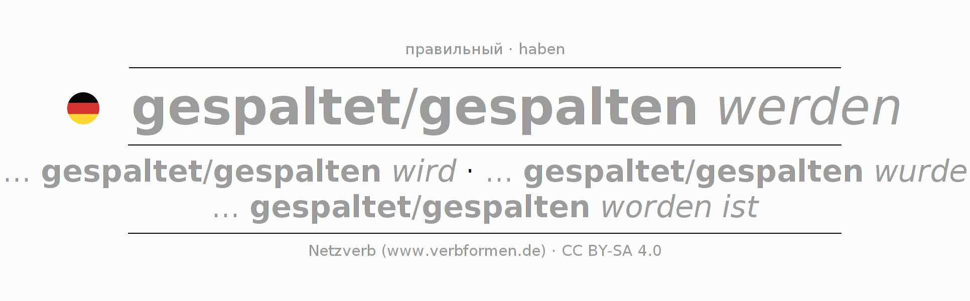 Спряжение spalten в Презенс Индикатив Настоящее время Пассив с werden: ... ich gespaltet/gespalten werde, ... du gespaltet/gespalten wirst, ... er gespaltet/gespalten wird, ... wir gespaltet/gespalten werden, ... ihr gespaltet/gespalten werdet, ... sie gespaltet/gespalten werden.Образование этих форм происходит по определённым грамматическим правилам. Так же спрягаются простые глагольные формы spalten в Презенс. Kомментарии ☆
