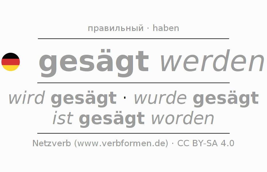 Спряжение sägen в Презенс Индикатив Настоящее время Пассив с werden: ich werde gesägt, du wirst gesägt, er wird gesägt, wir werden gesägt, ihr werdet gesägt, sie werden gesägt.Образование этих форм происходит по определённым грамматическим правилам. Так же спрягаются простые глагольные формы sägen в Презенс. Kомментарии ☆