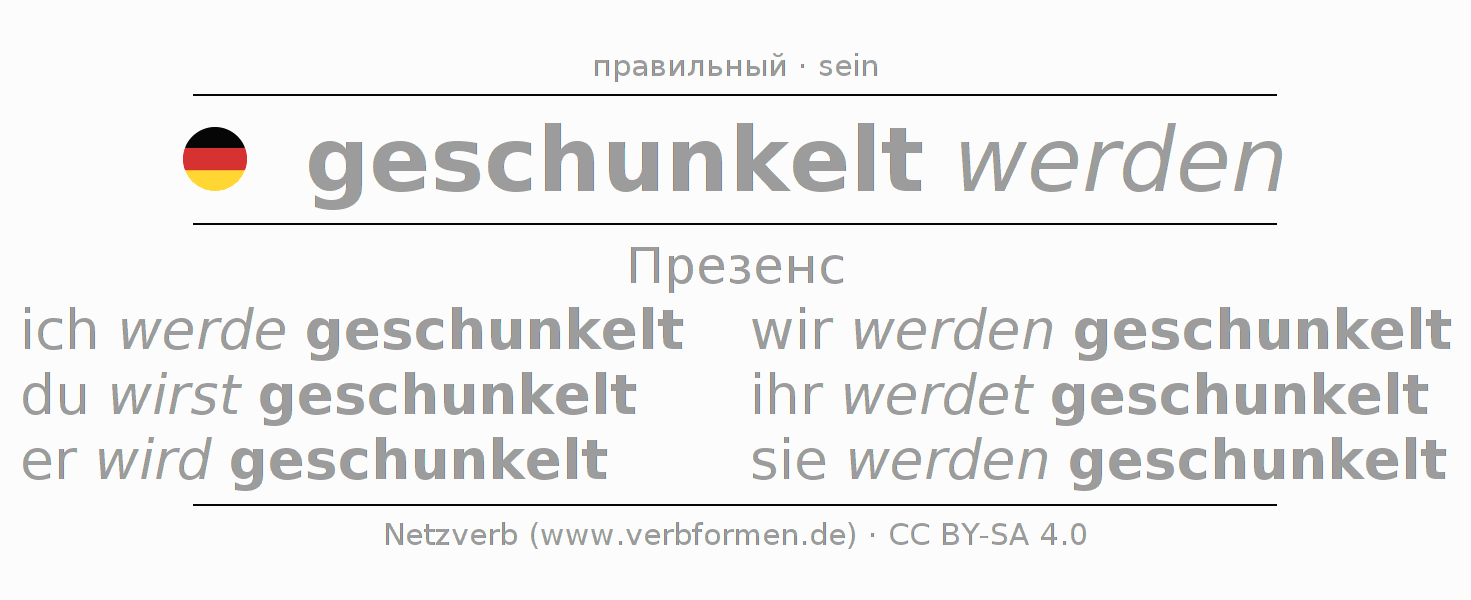 Спряжение schunkeln в Презенс Индикатив Настоящее время Пассив с werden: ich werde geschunkelt, du wirst geschunkelt, er wird geschunkelt, wir werden geschunkelt, ihr werdet geschunkelt, sie werden geschunkelt.Образование этих форм происходит по определённым грамматическим правилам. Так же спрягаются простые глагольные формы schunkeln в Презенс. Kомментарии ☆