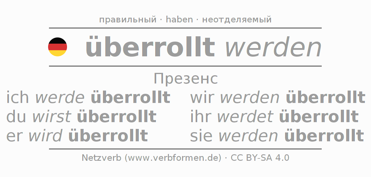 Спряжение überrollen в Презенс Индикатив Настоящее время Пассив с werden: ich werde überrollt, du wirst überrollt, er wird überrollt, wir werden überrollt, ihr werdet überrollt, sie werden überrollt.Образование этих форм происходит по определённым грамматическим правилам. Так же спрягаются простые глагольные формы überrollen в Презенс. Kомментарии ☆
