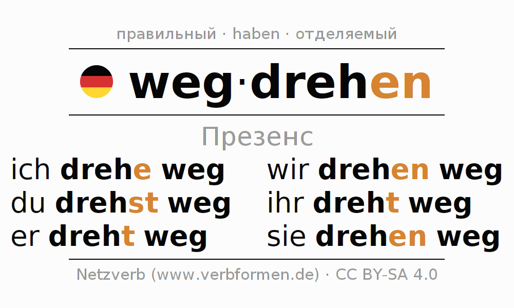 Спряжение wegdrehen (отворачиваться, отвернуть) в настоящем времени Презенс: ich drehe weg, du drehst weg, er dreht weg, wir drehen weg, ihr dreht weg, sie drehen weg