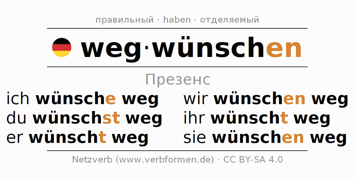 Спряжение wegwünschen (удалить по желанию) в настоящем времени Презенс: ich wünsche weg, du wünschst weg, er wünscht weg, wir wünschen weg, ihr wünscht weg, sie wünschen weg