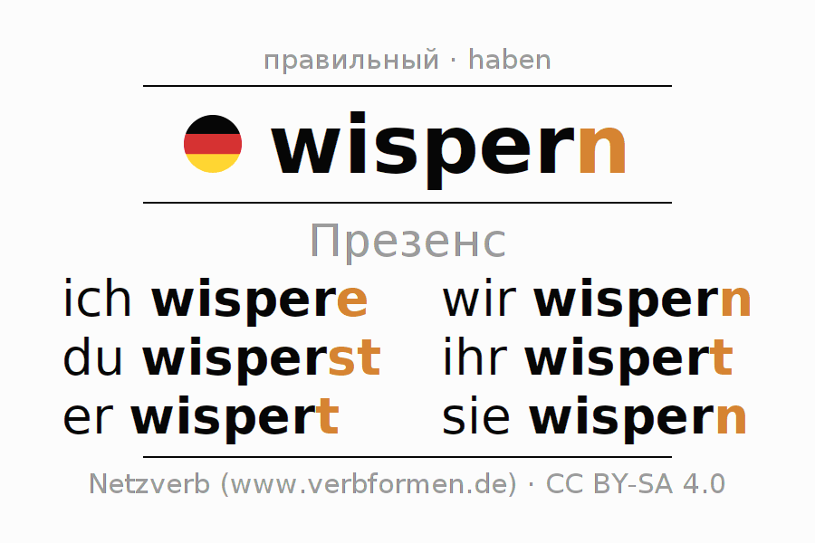 Спряжение wispern (шептать, прошептать) в настоящем времени Презенс: ich wisp(e)re, du wisperst, er wispert, wir wispern, ihr wispert, sie wispern