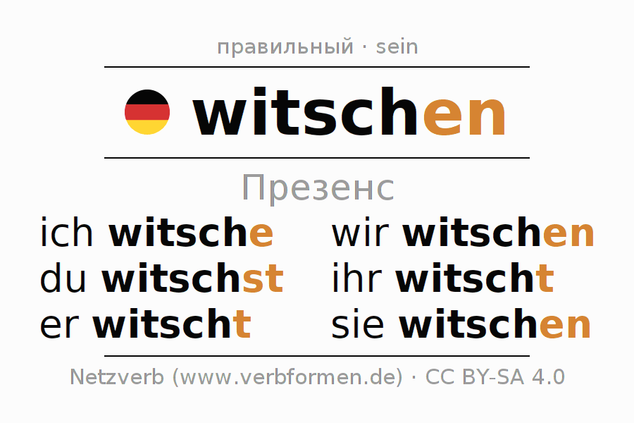 Спряжение witschen (подражающий движению, шумный) в настоящем времени Презенс: ich witsche, du witschst, er witscht, wir witschen, ihr witscht, sie witschen