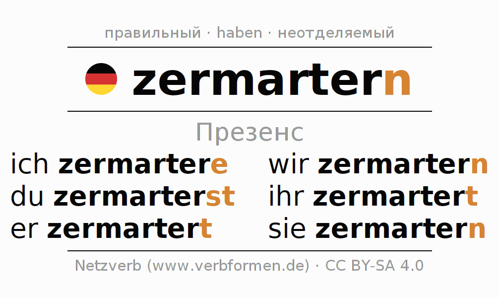 Спряжение zermartern (мучить, терзать) в настоящем времени Презенс: ich zermart(e)re, du zermarterst, er zermartert, wir zermartern, ihr zermartert, sie zermartern
