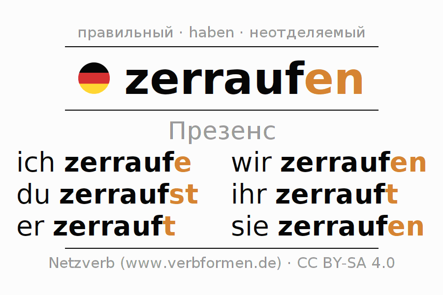 Спряжение zerraufen (растрепать, растрёпывать) в настоящем времени Презенс: ich zerraufe, du zerraufst, er zerrauft, wir zerraufen, ihr zerrauft, sie zerraufen