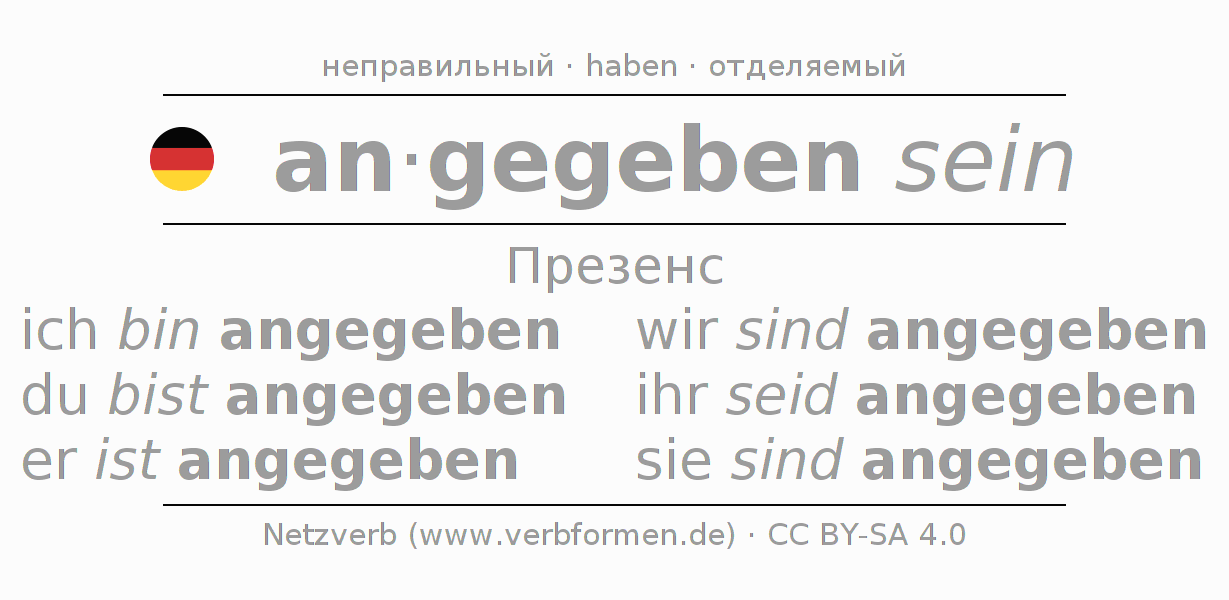 Спряжение angeben в Презенс Индикатив Настоящее время Пассив с sein: ich bin angegeben, du bist angegeben, er ist angegeben, wir sind angegeben, ihr seid angegeben, sie sind angegeben.Образование этих форм происходит по определённым грамматическим правилам. Так же спрягаются простые глагольные формы angeben в Презенс. Kомментарии ☆