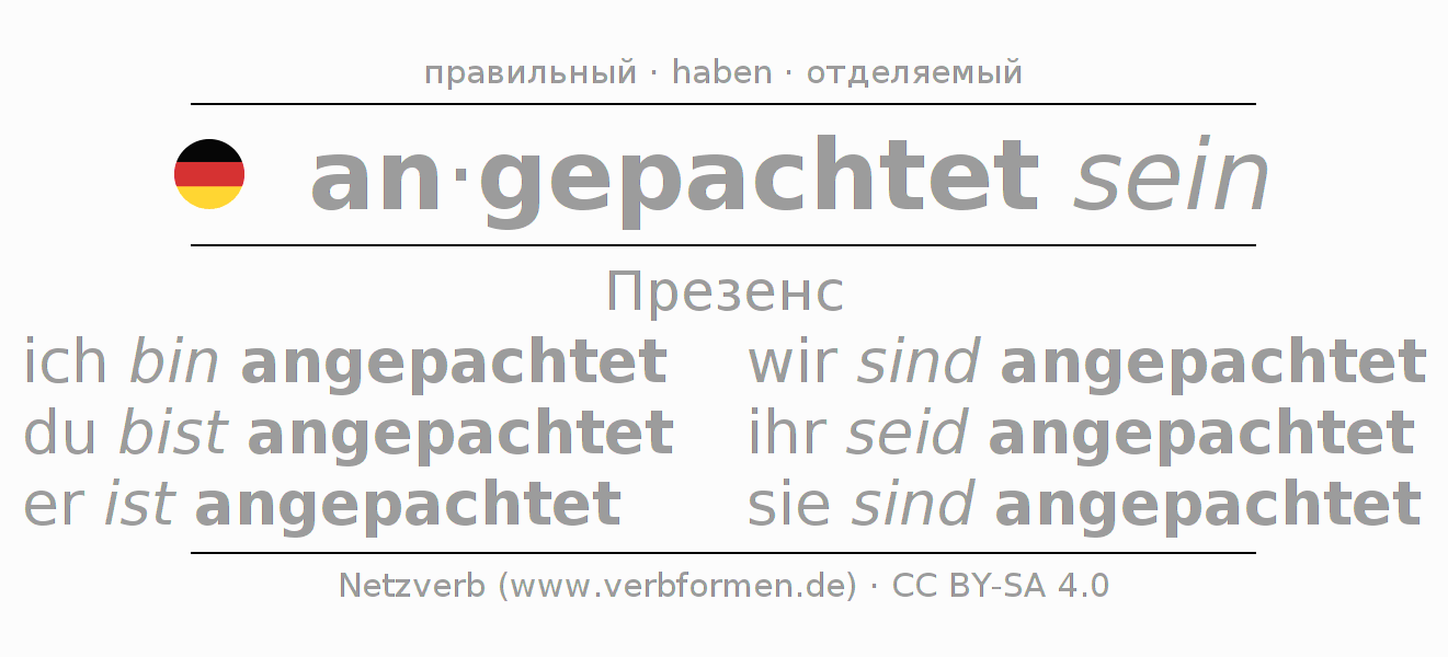 Спряжение anpachten в Презенс Индикатив Настоящее время Пассив с sein: ich bin angepachtet, du bist angepachtet, er ist angepachtet, wir sind angepachtet, ihr seid angepachtet, sie sind angepachtet.Образование этих форм происходит по определённым грамматическим правилам. Так же спрягаются простые глагольные формы anpachten в Презенс. Kомментарии ☆