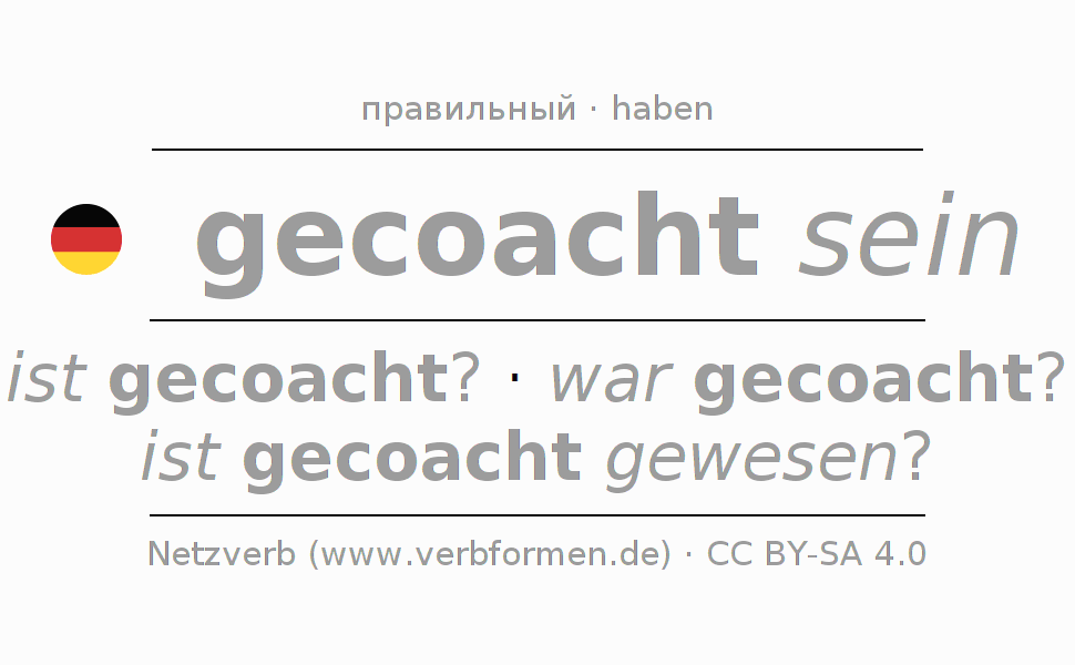 Спряжение coachen в Презенс Индикатив Настоящее время Пассив с sein: bin ich gecoacht?, bist du gecoacht?, ist er gecoacht?, sind wir gecoacht?, seid ihr gecoacht?, sind sie gecoacht?.Образование этих форм происходит по определённым грамматическим правилам. Так же спрягаются простые глагольные формы coachen в Презенс. Kомментарии ☆
