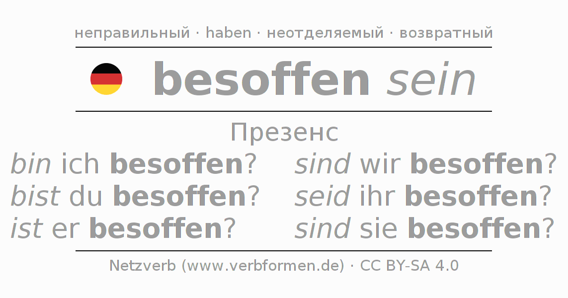 Спряжение sich besaufen в Презенс Индикатив Настоящее время Пассив с sein: bin ich besoffen?, bist du besoffen?, ist er besoffen?, sind wir besoffen?, seid ihr besoffen?, sind sie besoffen?.Образование этих форм происходит по определённым грамматическим правилам. Так же спрягаются простые глагольные формы besaufen в Презенс. Kомментарии ☆