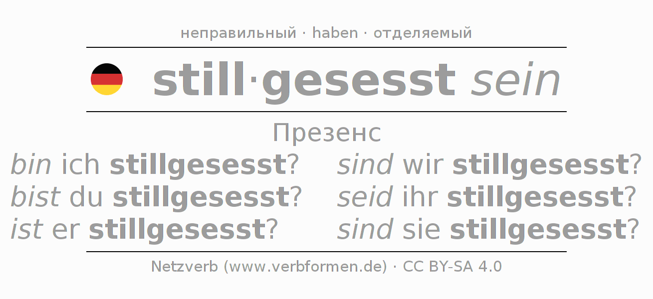 Спряжение stillsitzen в Презенс Индикатив Настоящее время Пассив с sein: bin ich stillgesesst?, bist du stillgesesst?, ist er stillgesesst?, sind wir stillgesesst?, seid ihr stillgesesst?, sind sie stillgesesst?.Образование этих форм происходит по определённым грамматическим правилам. Так же спрягаются простые глагольные формы stillsitzen в Презенс. Kомментарии ☆