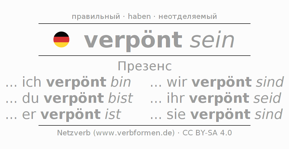 Спряжение verpönen в Презенс Индикатив Настоящее время Пассив с sein: ... ich verpönt bin, ... du verpönt bist, ... er verpönt ist, ... wir verpönt sind, ... ihr verpönt seid, ... sie verpönt sind.Образование этих форм происходит по определённым грамматическим правилам. Так же спрягаются простые глагольные формы verpönen в Презенс. Kомментарии ☆