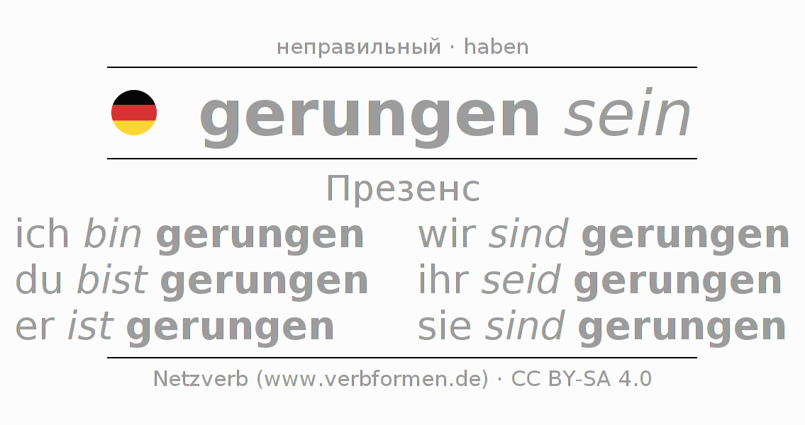 Спряжение ringen в Презенс Индикатив Настоящее время Пассив с sein: ich bin gerungen, du bist gerungen, er ist gerungen, wir sind gerungen, ihr seid gerungen, sie sind gerungen.Образование этих форм происходит по определённым грамматическим правилам. Так же спрягаются простые глагольные формы ringen в Презенс. Kомментарии ☆